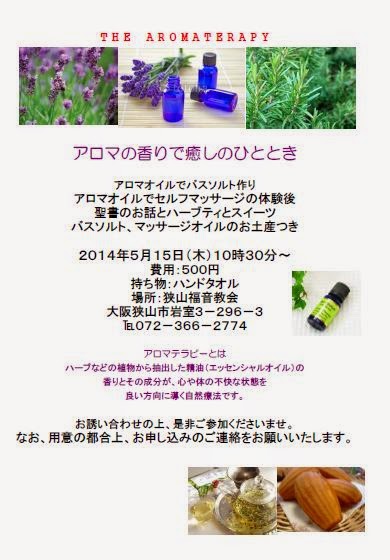 「アロマの香りで癒しのひととき」開催します 2014-04-262018-03-15 投稿者: sayamaec 来る2014年5月15日(木)、木曜集会のスペシャル版として、 バスソルト作りとアロママッサージが開催されます。 聖書に出てくる香りにちなんだお話とティータイムもあります。 案内チラシです。 ↓
