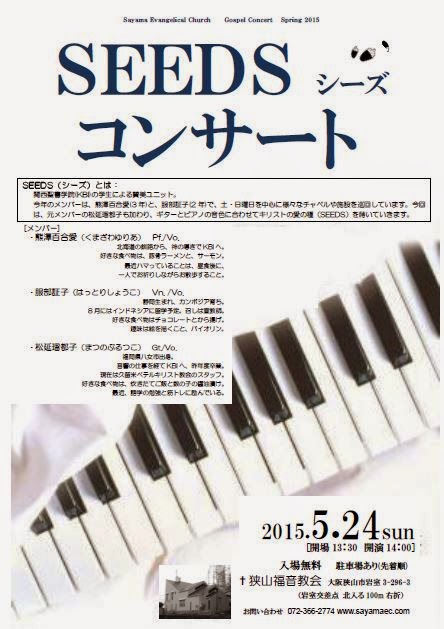 5月24日 SEEDSコンサートのご案内 2015-05-072018-03-15 投稿者: sayamaec 午後2時より、関西聖書学院(KBI)の賛美ユニット、SEEDSのコンサートです。 キーボード、ギター、バイオリンと歌声で、初めての方も大歓迎のひとときです。 入場無料、どうぞお越しください! お問い合わせは 狭山福音教会 sayama@jec-net.org まで。